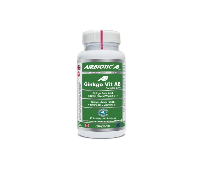 Ginkgo-Vit AB complex 6000 de Airbiotic combina ginkgo con vitamina B6, ácido fólico y vitamina B12, nutrientes que apoyan el metabolismo normal de la homocisteína, la función psicológica adecuada y el correcto funcionamiento del sistema nervioso.