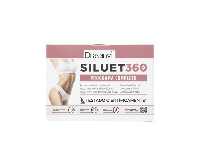 Siluet 360º, el programa completo de Drasanvi, es un complemento alimenticio diseñado para la pérdida de peso, que presenta una fórmula basada en extractos vegetales, vitaminas, minerales y el innovador complejo Fiit-ns®, respaldado por estudios clínicos.