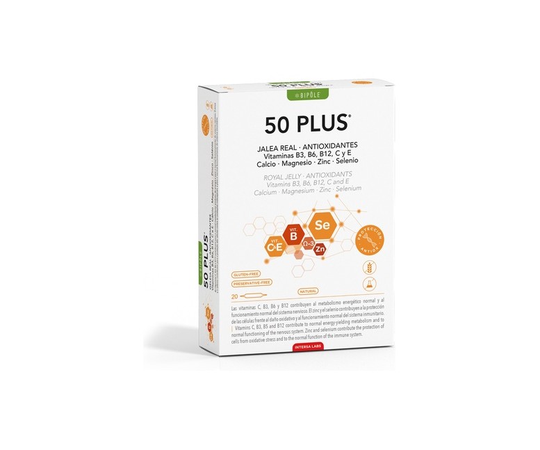 Bipole 50 Plus de Intersa proporciona los nutrientes esenciales para mantener un estado de salud óptimo a partir de los 50 años y durante la tercera edad.
