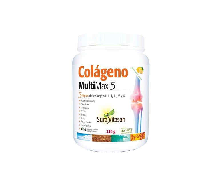 Potente mezcla de colágenos enriquecida con vitaminas, minerales y nutracéuticos. El Colágeno MultiMax 5 de SuraVitasan incluye 5 tipos de péptidos de colágeno bioactivos (tipos I, II, III, V y X) que se encuentran principalmente en huesos, tendones, cartílagos y piel. Su origen animal es colágeno hidrolizado de porcino, bovino y pollo, así como la membrana interna de la cáscara de huevo.